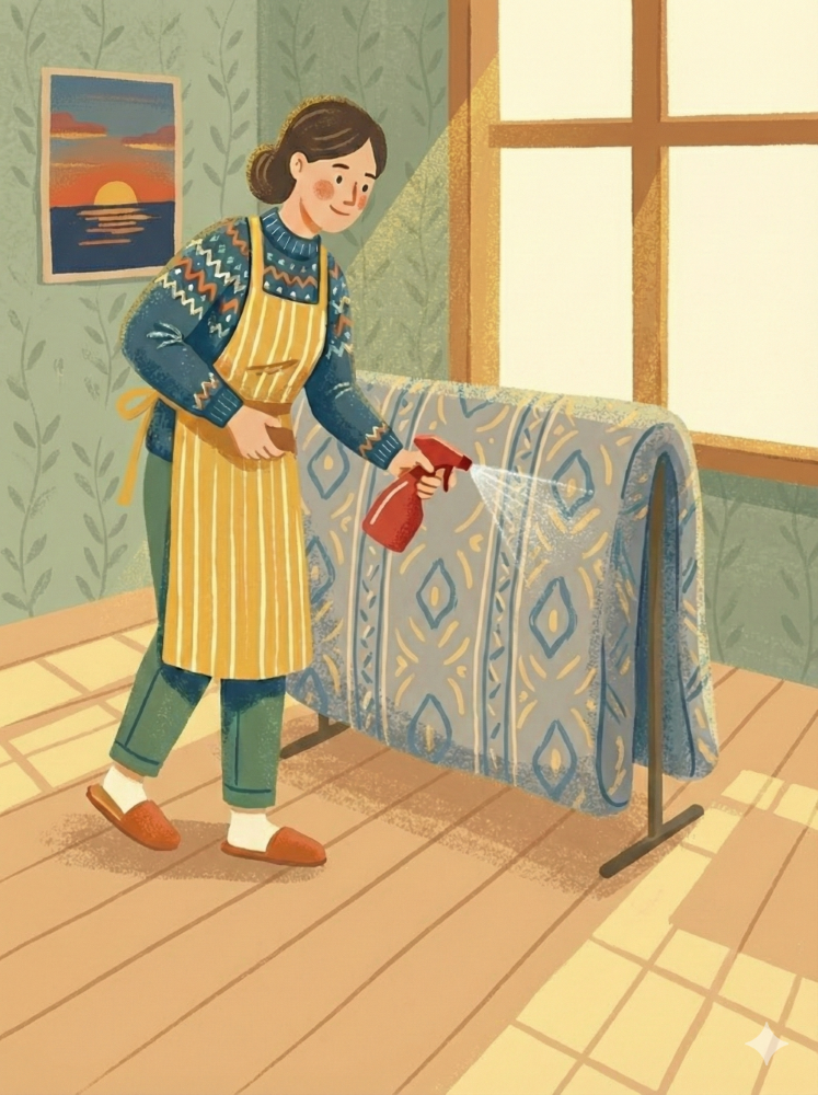 【1】掛ふとんをチェックした後、除菌・消臭スプレーをかけます。